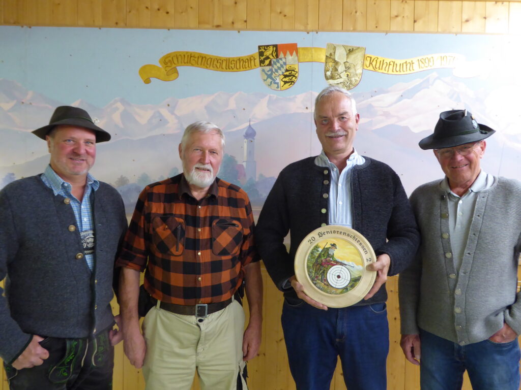 Seit 40 Jahren treffen sich die Älteren der Schützengesellschaft „Kuhflucht“ Farchant zu einem „Seniorenschießen“, diesmal wurde sitzend aufgelegt auf 50 Meter mit den Kleinkalibergewehren geschossen. Das beste Ergebnis der 19 Starter erzielte hier Arnold Koch mit 96 Ringen, zweiter wurde mit einem sehr guten 19,3-Teiler Thomas Maurer, auf Platz drei lag mit 96 Ringen Michael Bertl. Die von Georg Leitenbauer gestiftete Ehrenscheibe überreichte 1. Schützenmeister Hans Schnitbauer Thomas Oellinger für seinen 389,1-Teiler auf „Fest“. Beim anschließenden gemütlichen Beisammensein mit einer kleinen Brotzeit für alle Helfer und Teilnehmer wurden noch so manche Anekdoten und Vorkommnisse aus vergangenen Zeiten ausgetauscht.